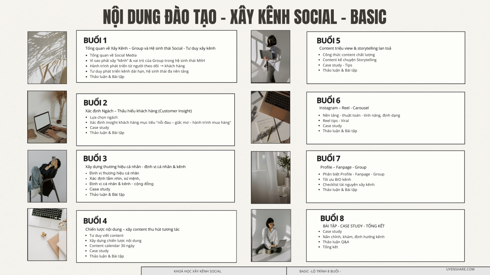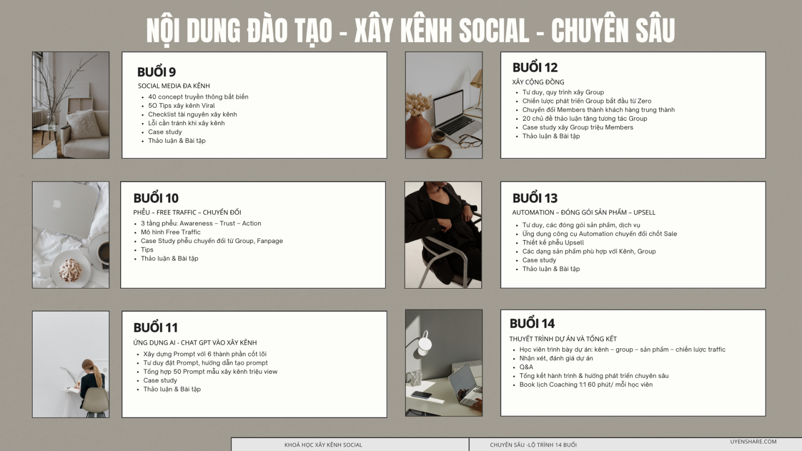 Uyên biết Bạn đang rất muốn phát triển công việc kinh doanh trên mạng xã hội, muốn xây dụng kênh truyền thông số như là tài sản cho riêng mình, muốn có được nhiều khán giả, muốn có được doanh thu từ khách hàng qua mạng xã hội, muốn thương hiệu sản phẩm, dịch vụ bạn, và cả chính bạn được lan toả!